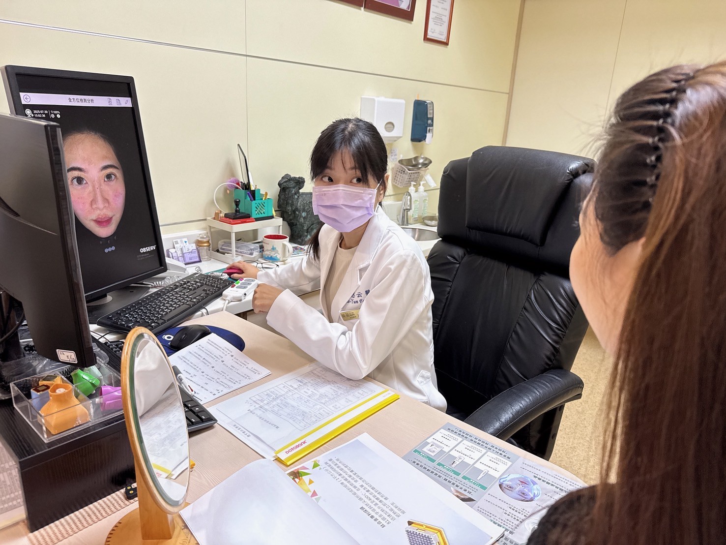 我先讓他們皮膚科醫師方思云看診,透過儀器檢測確認肌膚狀況才進行治療。簡單說一下,透過提可塑Tixel微針全臉來強化外泌體的吸收!
