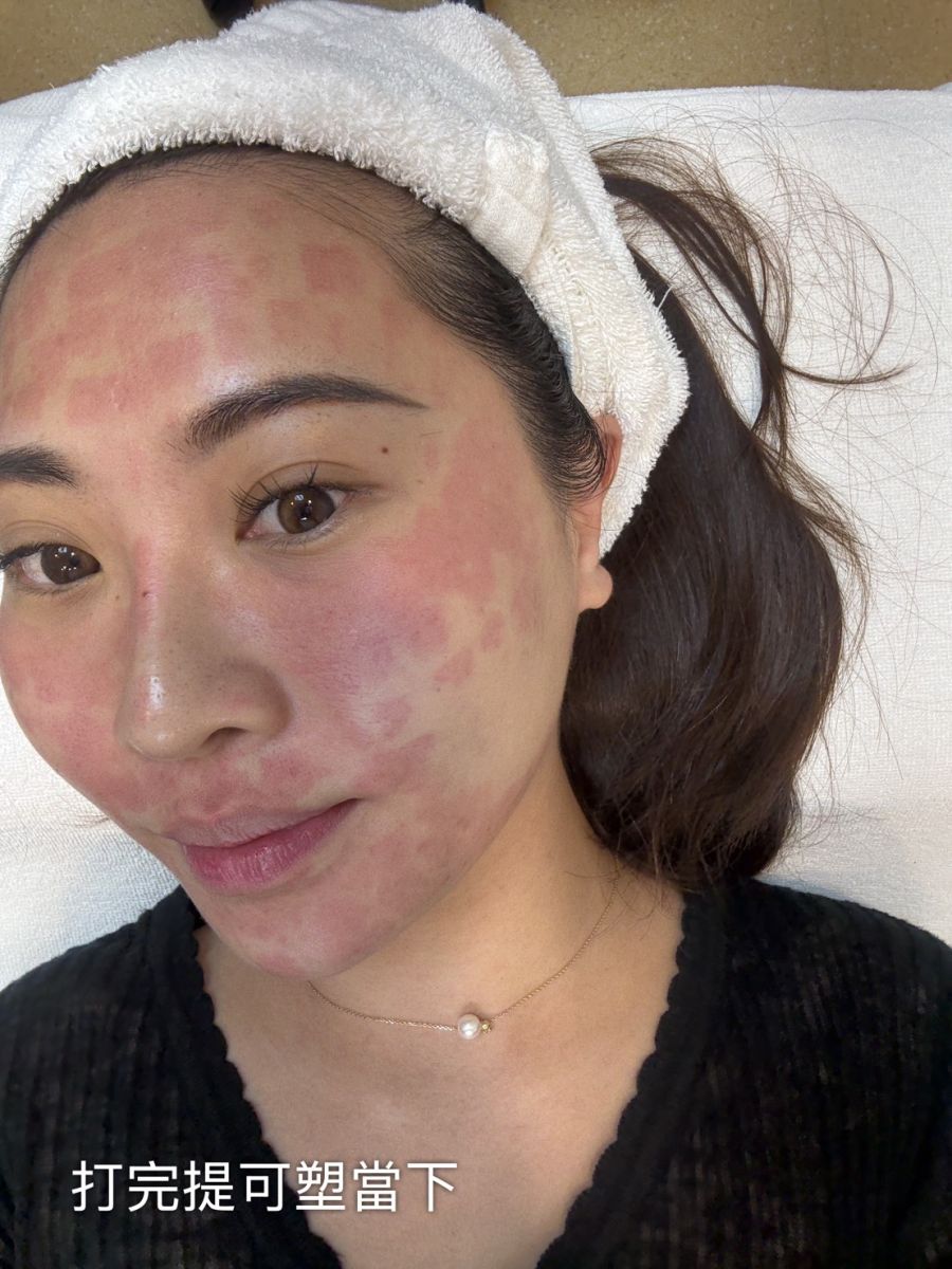 而我本來就是敏感肌,皮膚很薄,所以在做提可塑Tixel的時候已經紅一塊一塊的,做完馬上擦擁有100億顆的ExoMuse安瓶精華,而後再敷上外泌體面膜加強鎖住成分(敷完臉就退紅的差不多了)✨