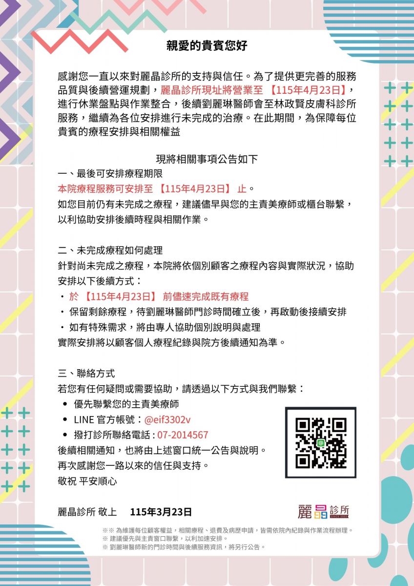 感謝您一直以來對麗晶診所的支持與信任。本院現址將營業至115年4月23日,